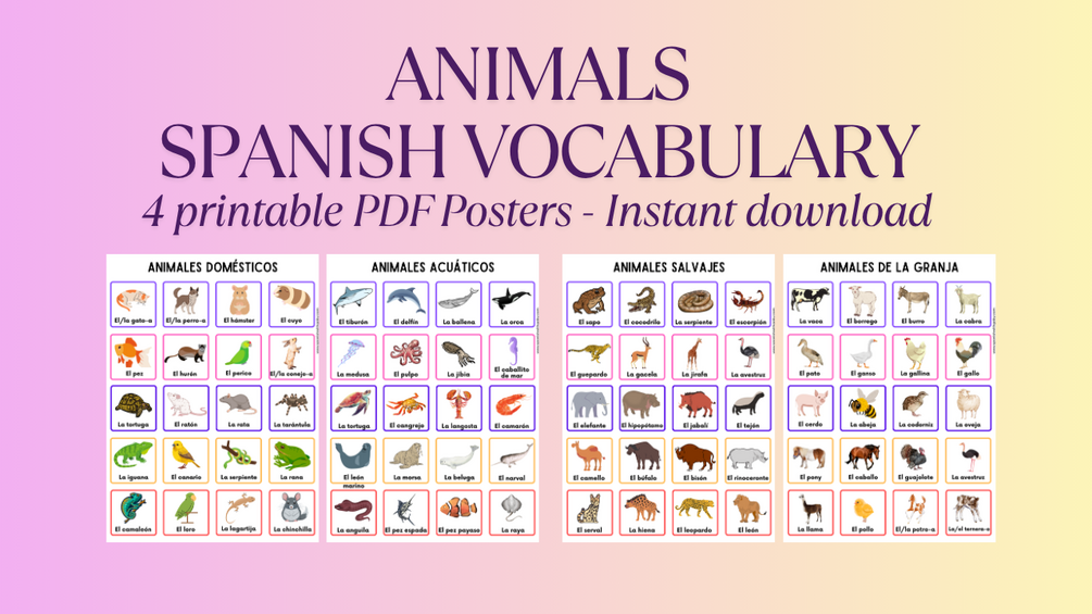 Includes animals from four categories: domestic, wild, aquatic, and farm. Perfect for Spanish learners of all levels.